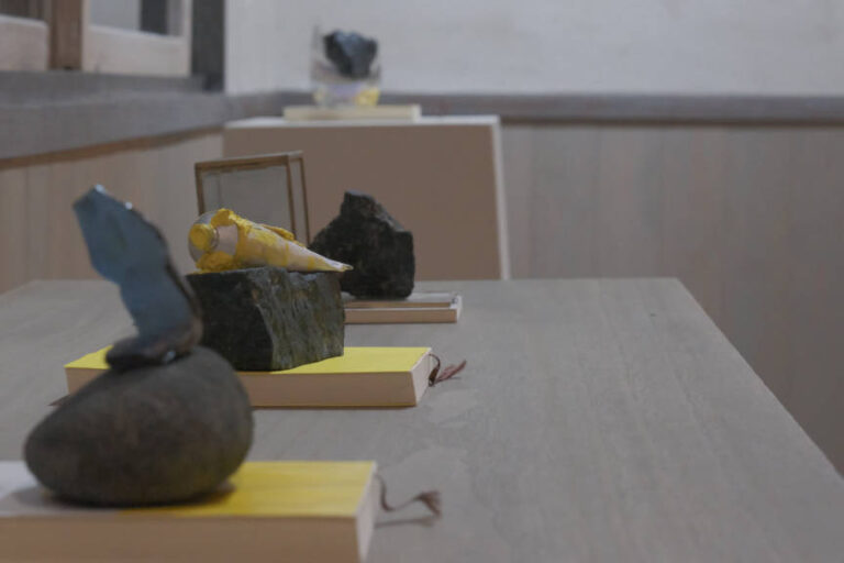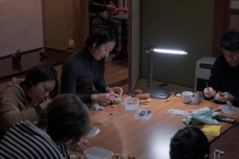 福井市内の「古書灯台」と「そばに映像舎 あわい読書室」の協力によって素材を入手するところから始める、というユニークな仕掛けを取り入れたワークショップで、参加者自らの街から海辺への移動の過程さえも作品のエッセンスとして加えたい、という目的もあり、山田さんに倣って、小石にガラス片を接着し、作品を制作するワークショップが開催されました。作品は展示期間中、会場の好きな場所に飾ることができました。