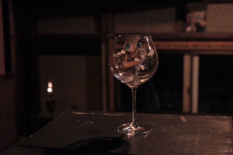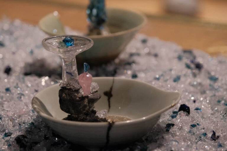 宮沢賢治を題材とし、ワタリグラススタジオで出たガラスの廃材を多く素材として使用し構成された内容でした。石の配置による庭からのアプローチも手伝い、「七ツ森」を中心に、母屋の空間全てに幻想世界が広がっていました。