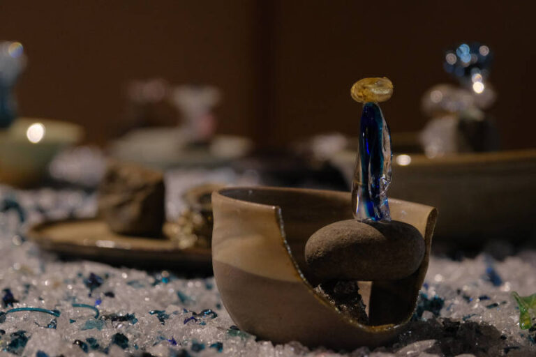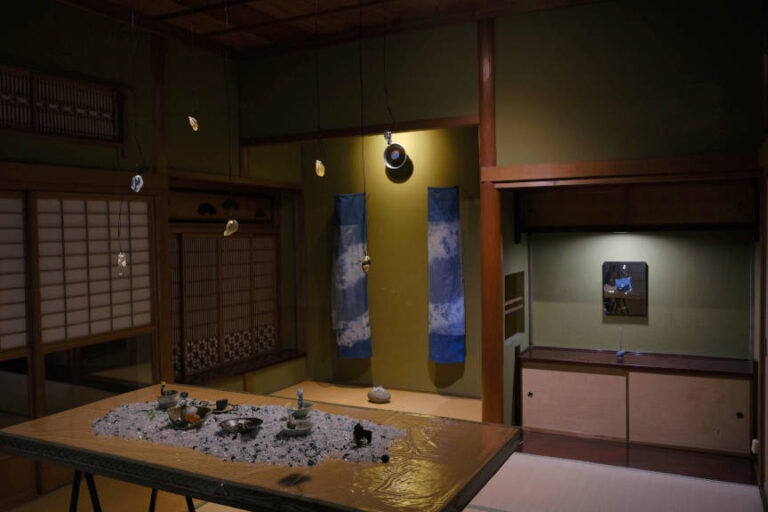 土を感じさせる陶器と、ガラスの欠片たち、石たちが、賢治の作品世界から光と色彩の詩のような表現で命を吹き込まれている空間は、古い民家だからこそ感じ取れる、あたたかさや居心地の良さとともに作品世界を味わうことのできる稀有な空間となっていました。
